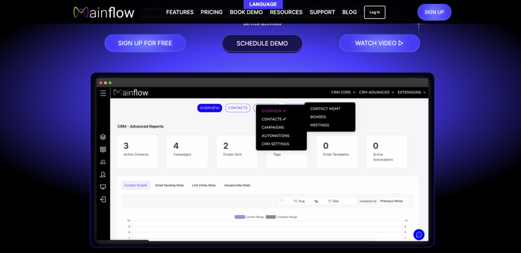 The apps on the Mainflow platform are: Contact Management & Email marketing / Sales Pipelines & Boards / Online meeting Booking / Social Media Auto-publishing / Customer Portals & Community / Support Tickets / Landing Pages / Analytics / Opt-in Forms / E-signature.